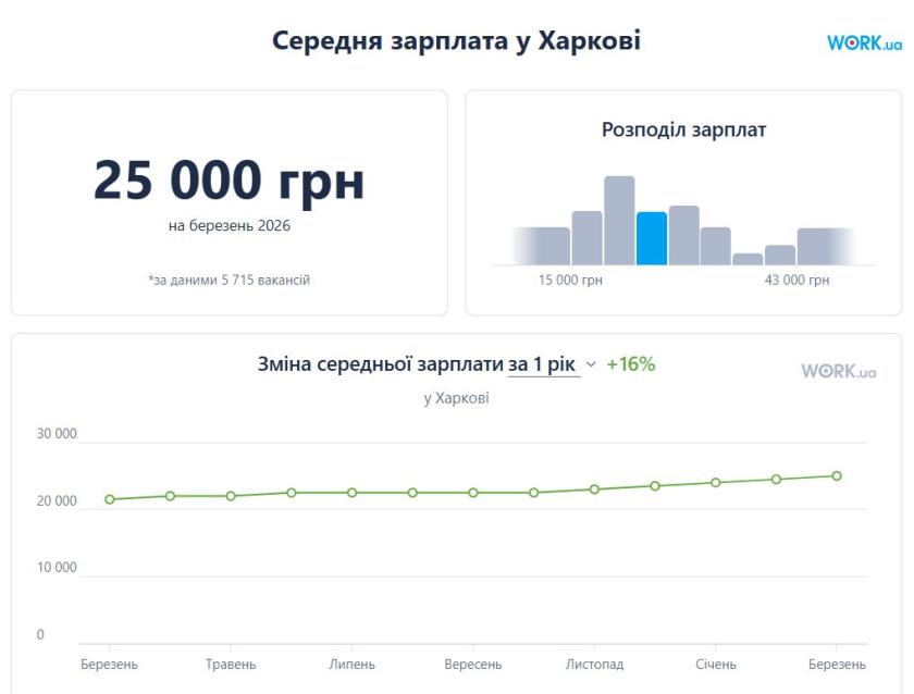 За даними аналітиків порталу з працевлаштування Work.ua, середня зарплата, яку пропонують роботодавці в Харкові, на березень 2026 року становить 25 000 гривень, і вона зросла за рік на 16%. Дані відрізняються від цифр Держстату, бо принцип підрахунку інший: спеціалісти порталу моніторять лише зарплату, зазначену в оголошеннях і лише в обласному центрі, де вона зазвичай вища, ніж в інших населених пунктах. Але загальні тенденції ринку праці прослідковуються і тут: середня зарплата вакансій Дніпра — на 2,5 тисяч гривень вища, Львова — на 4,5 тисячі, Києва — аж на 8 тисяч.