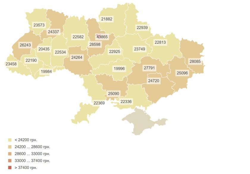 Найменше ж заробляють в Чернівецькій та Кіровоградській областях, де середньомісячна зарплата не дотягує навіть до 20 тис грн.