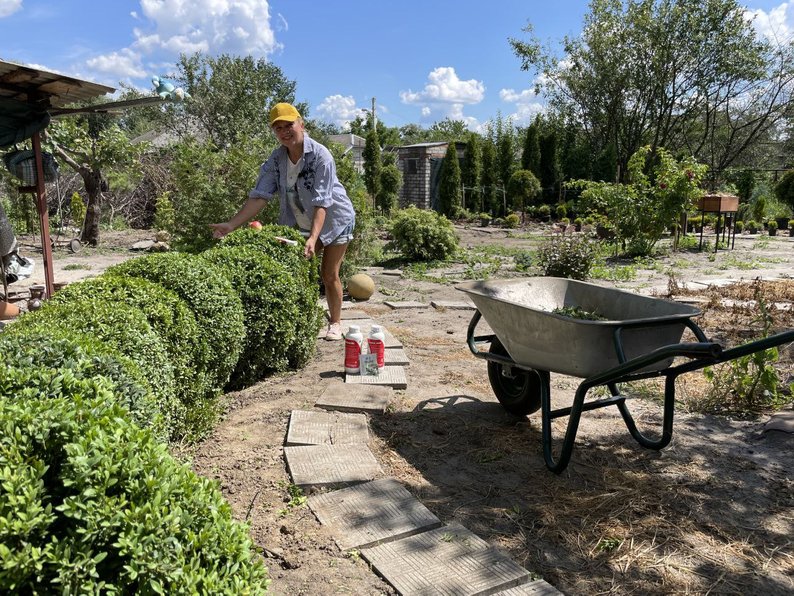 "Як кажуть, жінка — шия, а чоловік — голова. Спочатку чоловік просто допомагав, якщо я просила. Згодом чоловік увімкнувся в роботу. Він зробив там паркан, лежаки, гамак, потім альтанку зробив. Тепер це наша справа, і ми робимо все разом", — розповідає садівниця.