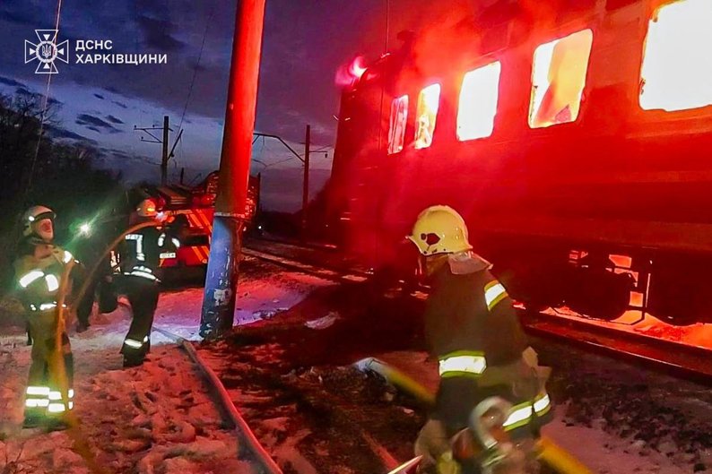 Пожежники біля охопленого вогнем вагону пасажирського поїзда, по якому поцілили росіяни, Харківська область, 27 січня 2026 року. ДСНС Харківщини