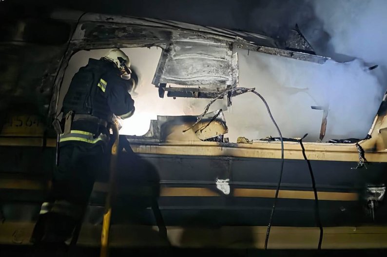Пожежа у вагоні поїзда, по якому завдали удару росіяни, Харківська область, 27 січня 2026 року. Олексій Кулеба/Telegram