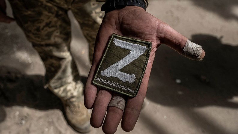 Український військовослужбовець показує російський військовий шеврон із символом Z і написом “своїх не кидаємо”, Сумщина, 13 серпня 2024 року. REUTERS/Viacheslav Ratynskyi