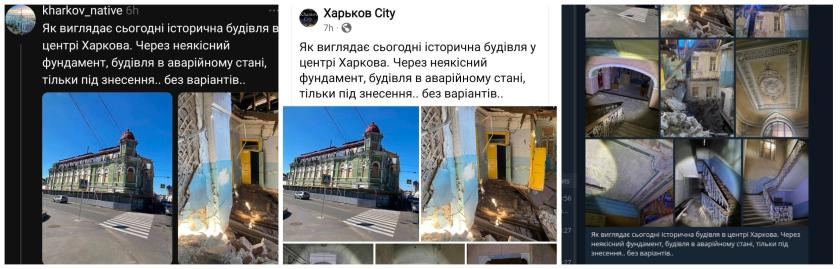Одразу декілька популярних міських пабліків у Telegram та Facebook днями опублікували однакові пости з видами приміщення будинку №1 по вулиці Полтавський шлях. Усі їх супроводжував однаковий, слово в слово, припис: “Через неякісний фундамент будівля в аварійному стані. Тільки під знесення, без варіантів”.