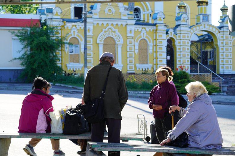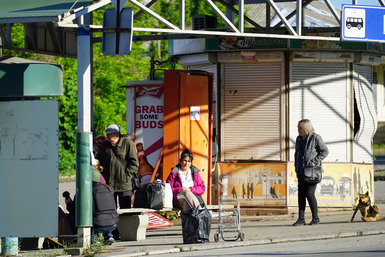 Жителі Куп’янська чекають на зупинці на соціальний автобус від “Проліски”. Суспільне Харків/Валерія Ємець
