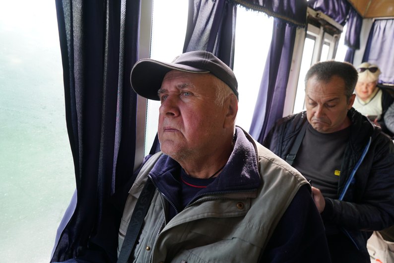 Серед пасажирів соціального автобуса — Віктор Кузьменко. Чоловік евакуювався до Харкова, але час від часу приїжджає до Куп'янська — перевіряє житло після російських влучань.